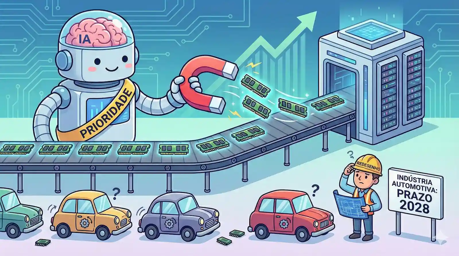 - Fabricantes de memória estão priorizando chips para inteligência artificial, reduzindo a oferta para o setor automotivo.
