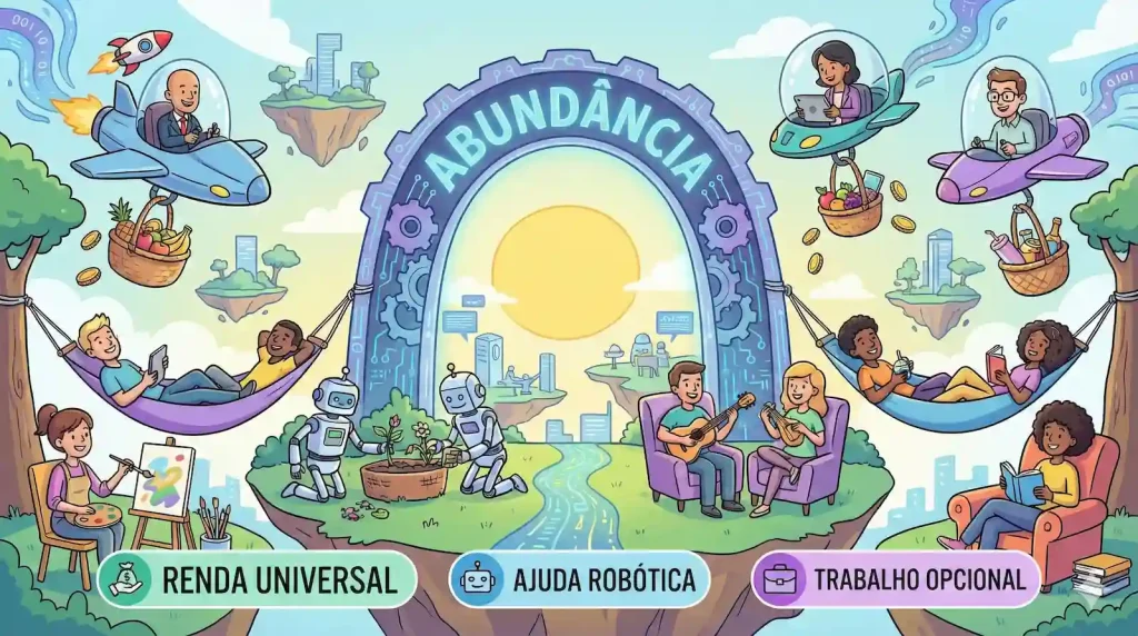 Essa visão parte da premissa de que sistemas de IA e robôs assumirão praticamente todo o trabalho produtivo, criando riqueza em escala suficiente para sustentar toda a população sem a necessidade de empregos tradicionais.