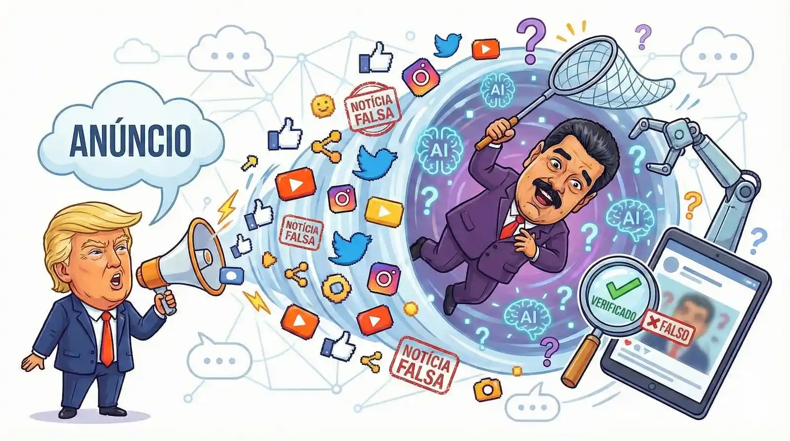Horas depois de Donald Trump anunciar que o presidente da Venezuela Nicolás Maduro teria sido capturado, imagens altamente realistas começaram a circular nas redes sociais, retratando uma suposta detenção que nunca aconteceu daquela forma.