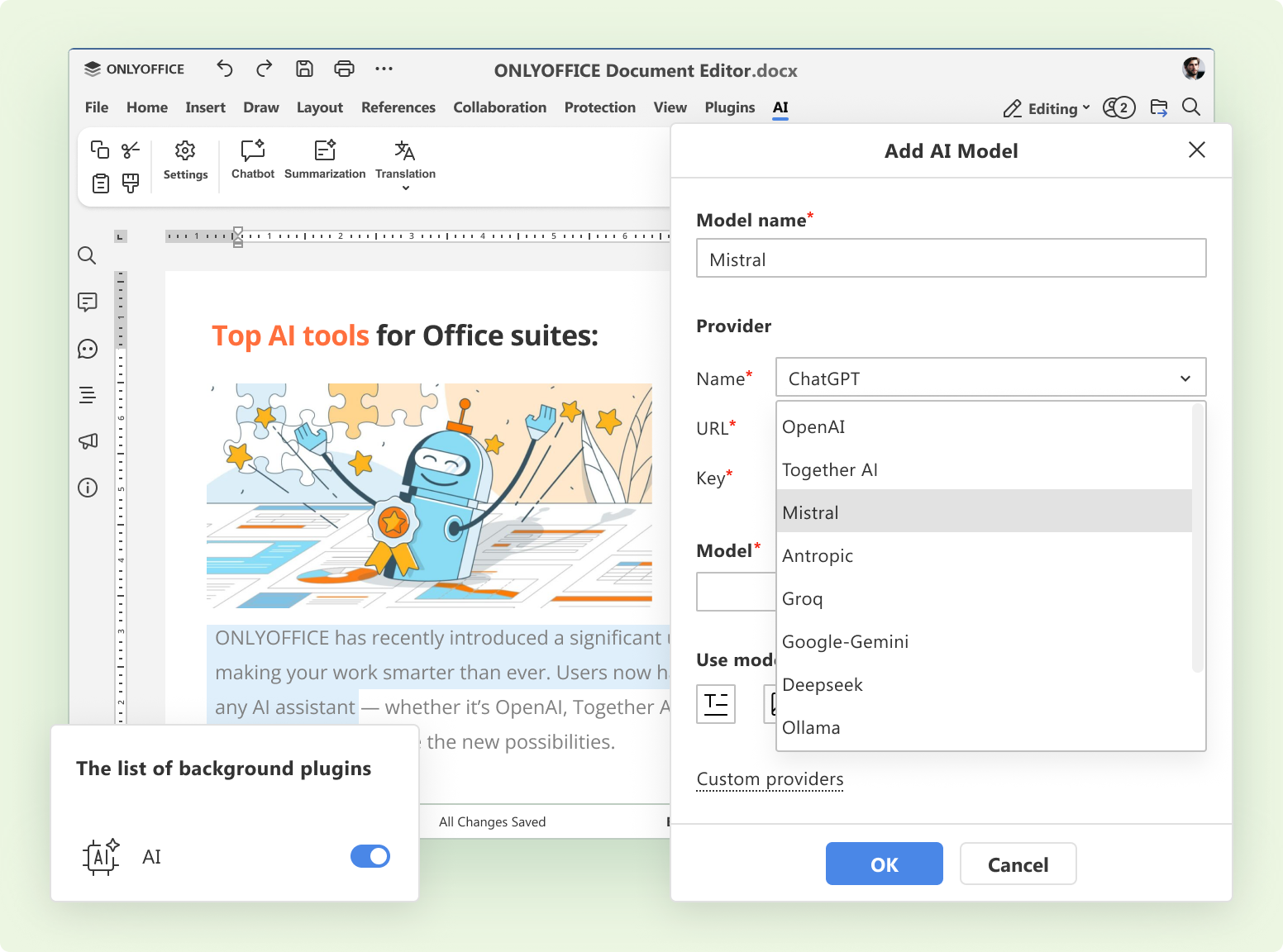 Com versões disponíveis para Windows, macOS e Linux, o ONLYOFFICE agora traz uma seleção de plugins úteis já instalados por padrão, como Photo Editor, OCR, Typograf, Doc2md, LanguageTool, DeepL, Thesaurus e Zotero.